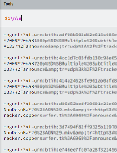 한 페이지에 여러개의 링크를 하나씩 받아야하는 경우라면 귀찮기 때문에 좀 쉽게 받고자 정규표현식을 이용하여 마그넷 주소만 필터링 할 수 있는 방법을 기록한다.