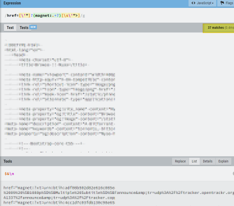 한 페이지에 여러개의 링크를 하나씩 받아야하는 경우라면 귀찮기 때문에 좀 쉽게 받고자 정규표현식을 이용하여 마그넷 주소만 필터링 할 수 있는 방법을 기록한다.